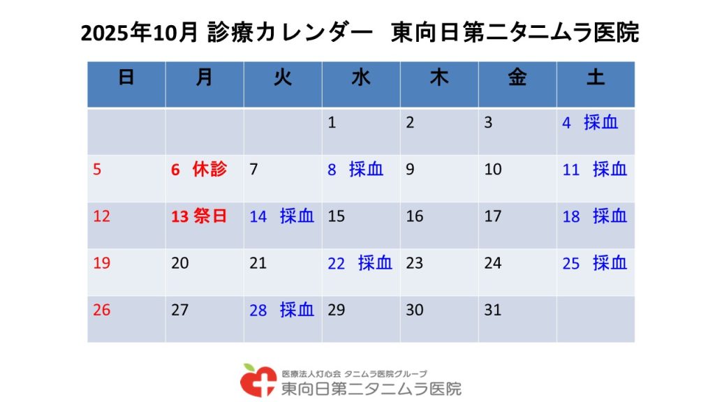 2025年10月診療カレンダー 10月6日(月)は休診 血液検査日は第2,4水、第3,5火、毎土曜日になります。